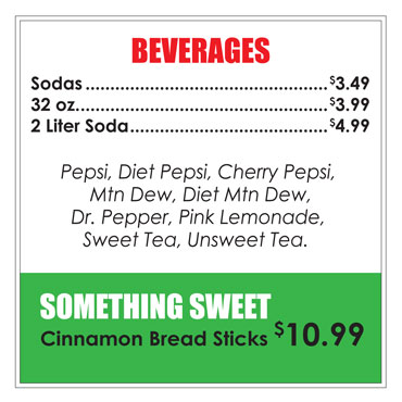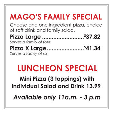 Large Family Special$37.82( Cheese and one ingredient pizza, choice of soft drink and family salad. Serves family of 4. )