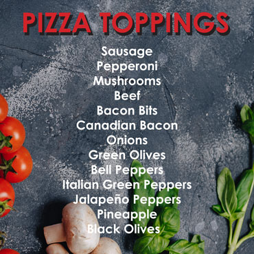 Favorites12" Medium$17.4614" Large$26.0716" Extra Large$30.34Salem Special( Pepperoni, Hamburger, Cheese, Bacon Bits, Onions, Mushrooms, Green Olives, Bell Peppers, IGP’s. )Little Egypt Special( Pepperoni, Sausage, Cheese, Onions, Mushrooms, Bell Peppers. )Italian Special( Sausage, Cheese, Onions, Green Olives, Mushrooms, IGP’s. )BBQ Chicken Pizza( BBQ Sauce, Cheese, Pieces of Chicken. )BLT Pizza( Bacon, Lettuce, Tomato, and Mayonaise. )Meat Lovers( Sausage, Pepperoni, Beef, Bacon Bits, Canadian Bacon. )Chicken Bacon Ranch Pizza( Pizza Souce, Chicken, Bacon Bits, and Ranch. )Veggie Pizza( Mushroom, Onions, Green Pepper, Olives, and Tomato. )Hawaiian Pizza( Bacon Bits, Ham, Onions, and Pineapple. )